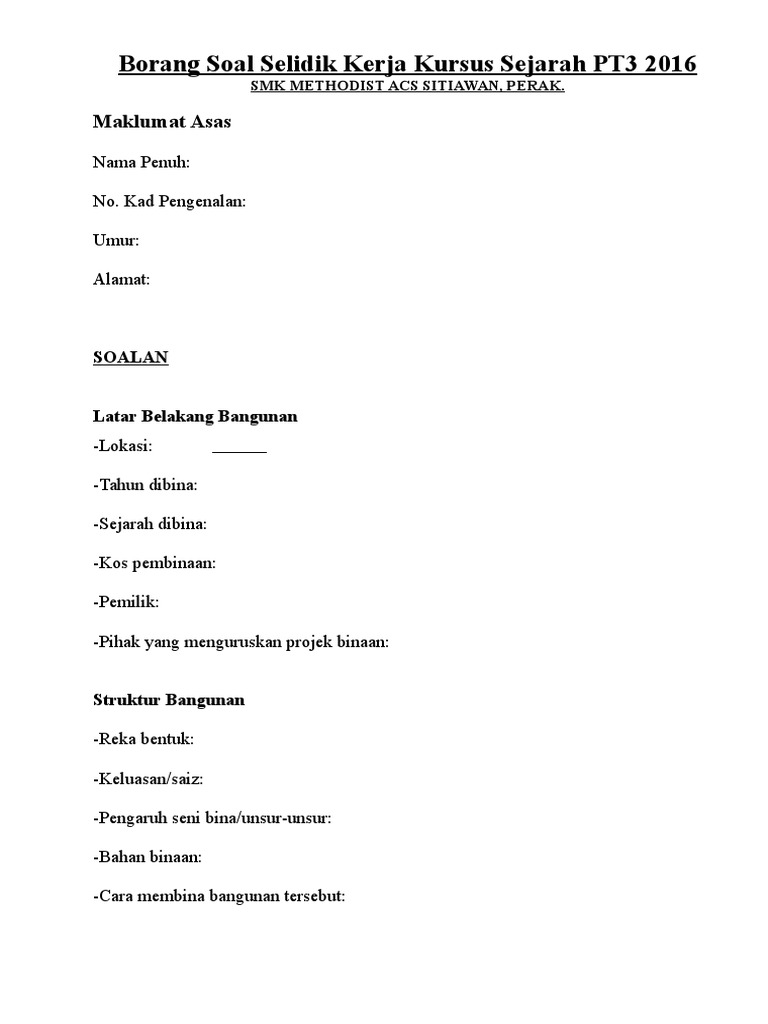 Borang Soal Selidik Kerja Kursus Sejarah Pt3 2016 Pdf